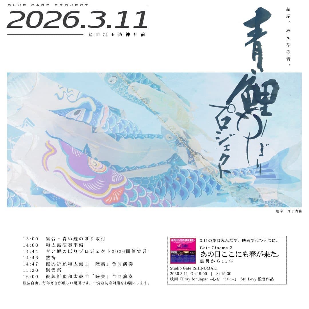 あの日を思い出す様な…たくさんの方々が天から舞い降りて来る様な風を感じながら、大曲新橋に小さい鯉のぼりが約100匹泳ぎ始めました。今年はウガンダのエイズで親を亡くした子供達、小学校の時に同時多発テロを経験したニューヨークの大学生達も一緒に14:46を過ごしました。そして、亡くなった方々の分も手を取り合って、世界中の子供達が平和で安心出来る未来がやって来る事を祈りました。