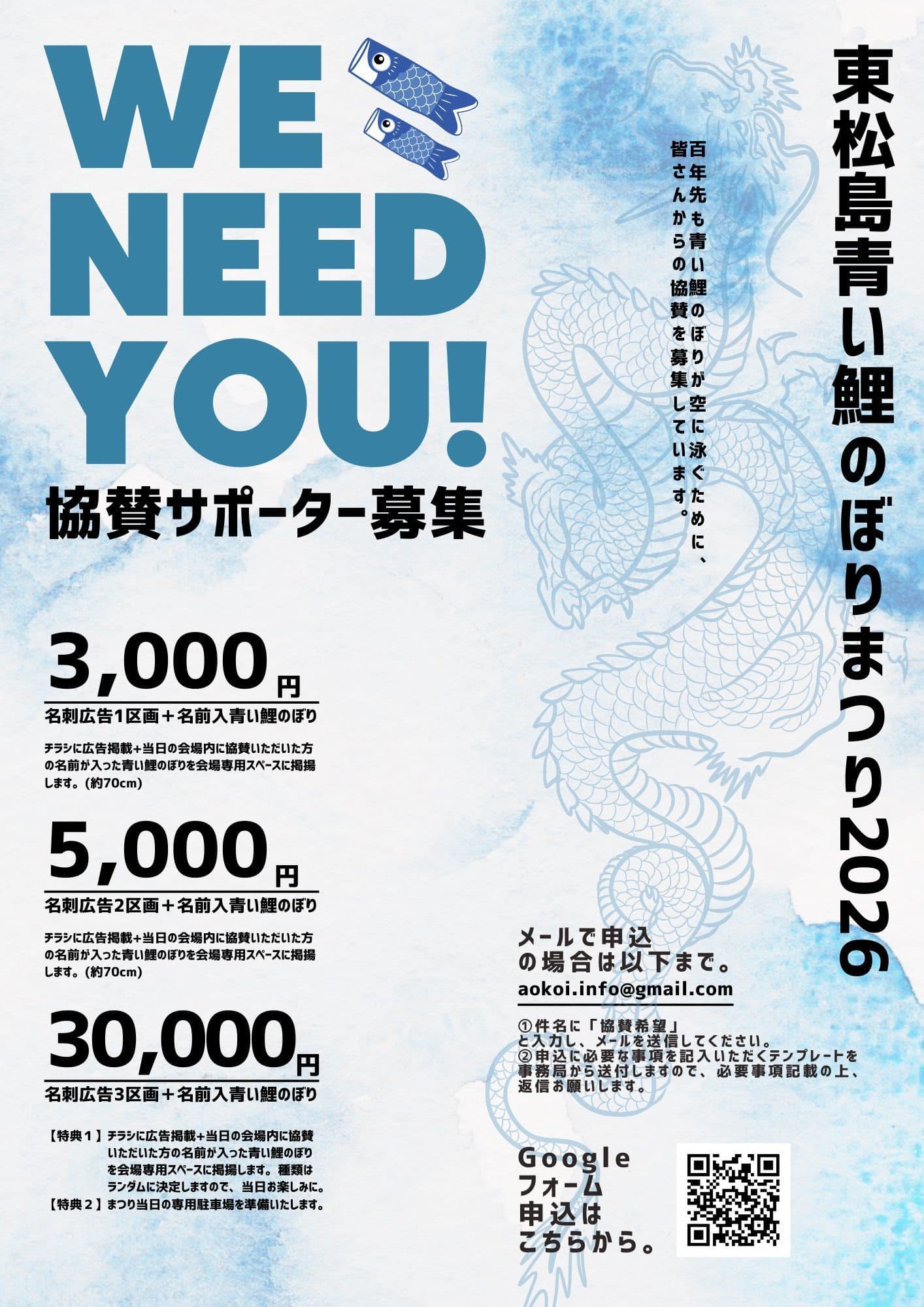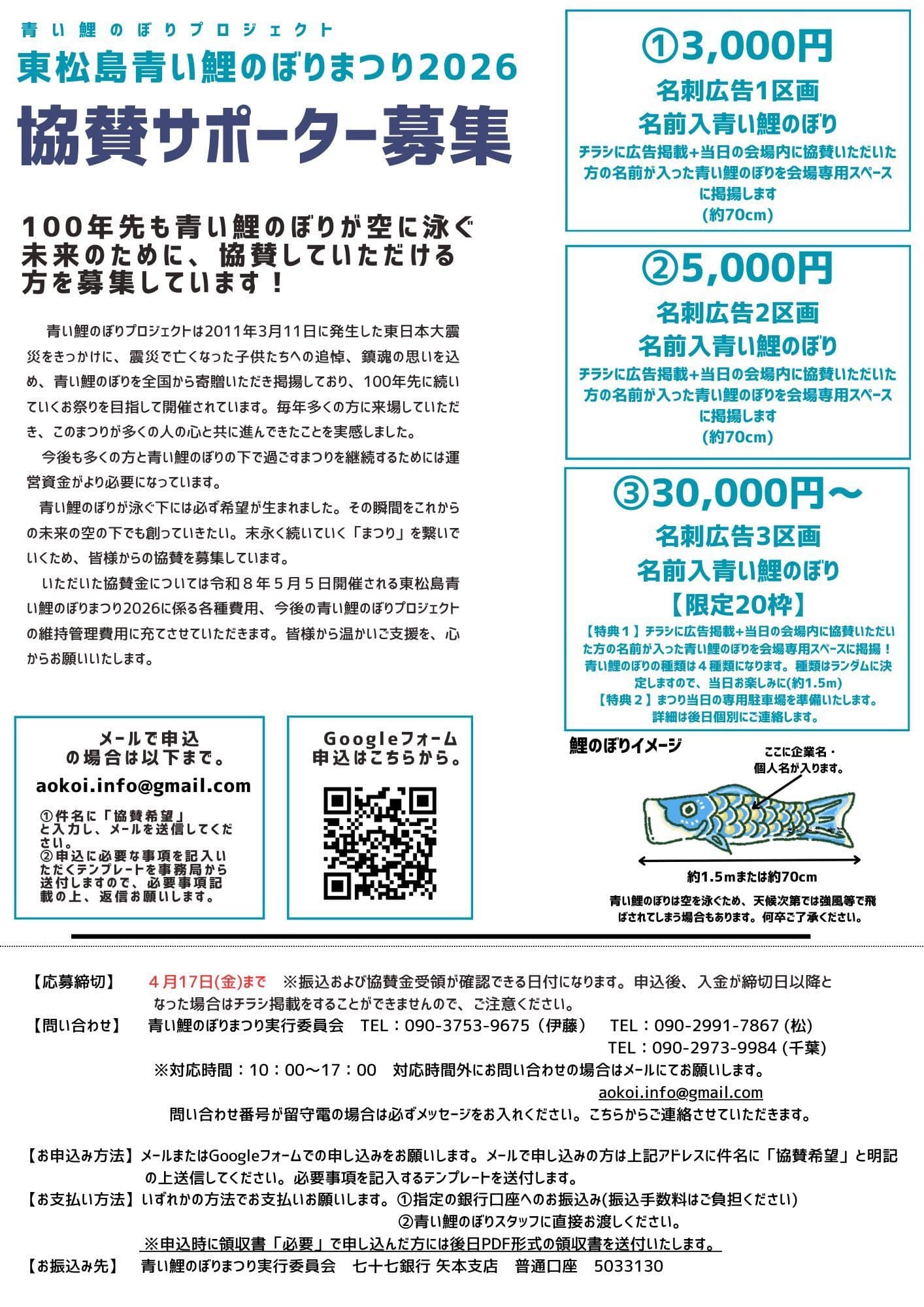 そしてもし不用になった「青い鯉のぼり」がありましたら私達に送ってください。私達の街や人々の復興のシンボルとして、そして亡くなったこども達が寂しくない様に沢山の青い鯉のぼりを空高く揚げたいと思います。