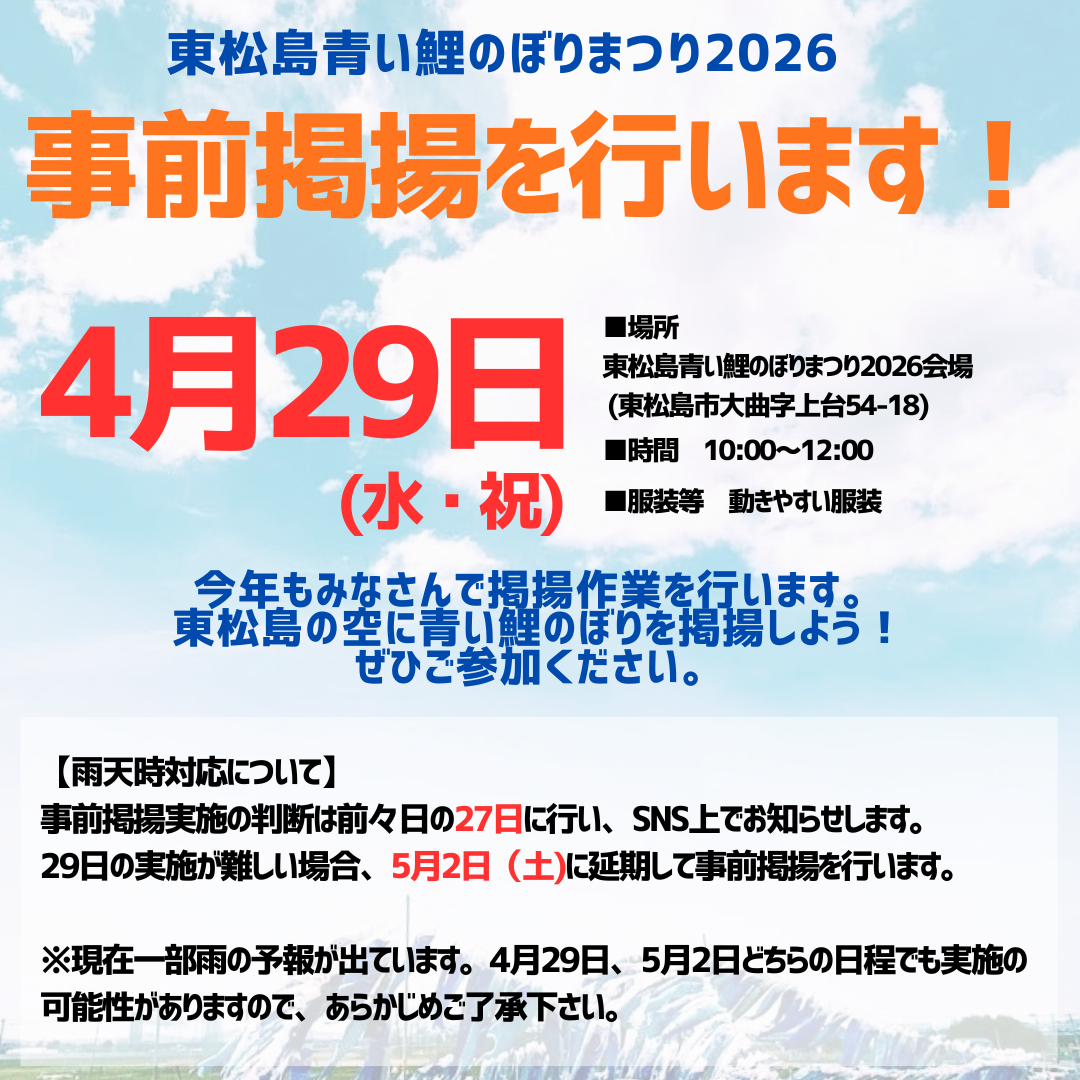 これにより27日10時から大曲浜にて昨年の5月5日までに集まった鯉のぼりが一挙に空を泳ぎます。また、昨年の5月6日以降に集まった青い鯉のぼりは5月5日に取り付け作業を行います。